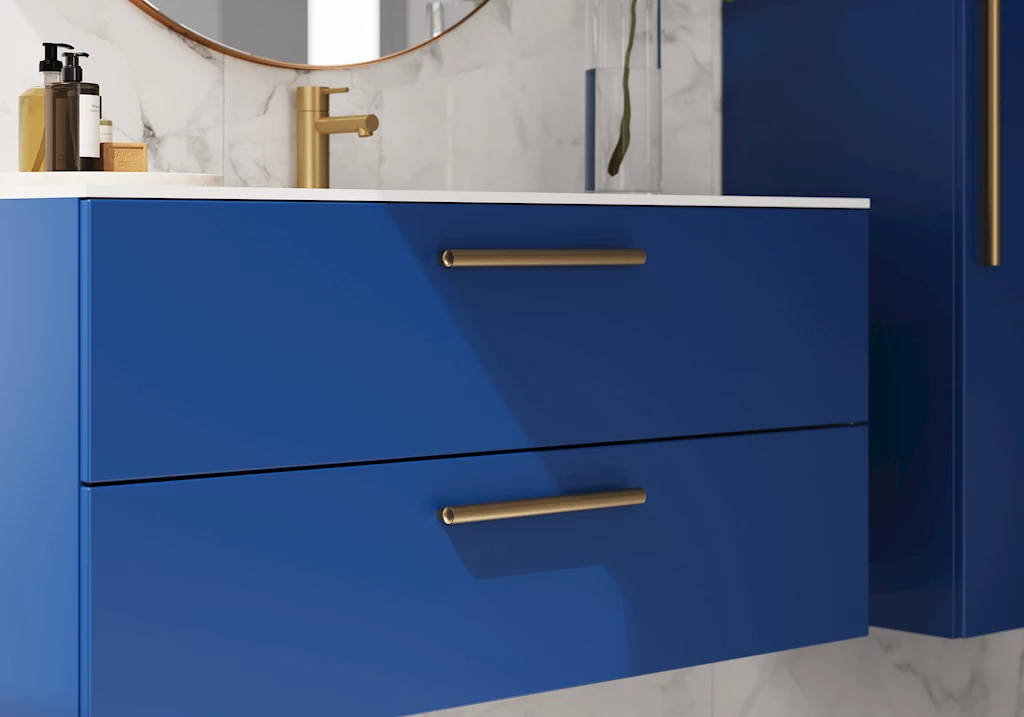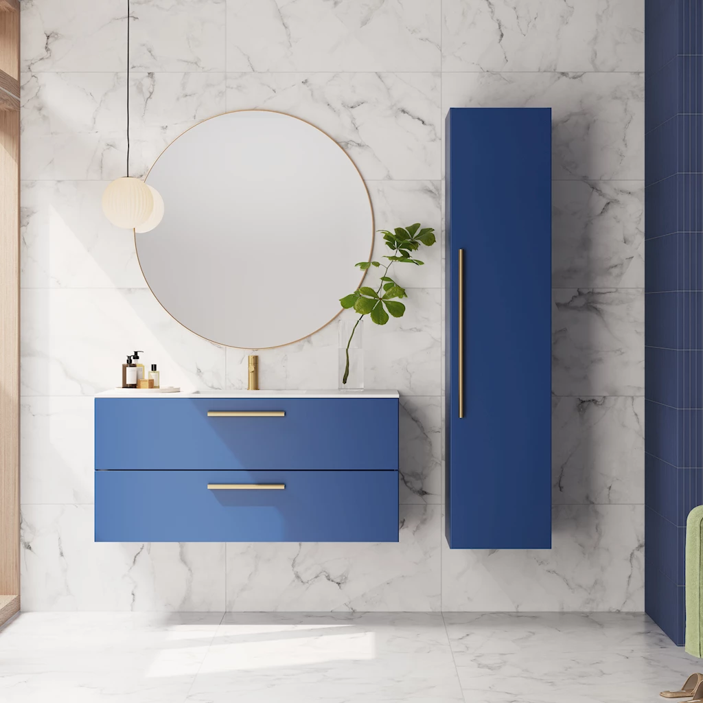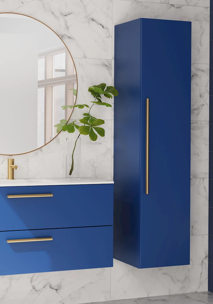INGRID Blå i 120 cm med corianplate og EIR servant. ØYRI speil uten lys i messing. Høyskap 40 cm og STI grep i messing.
